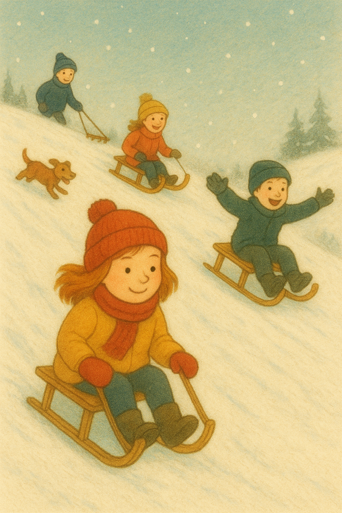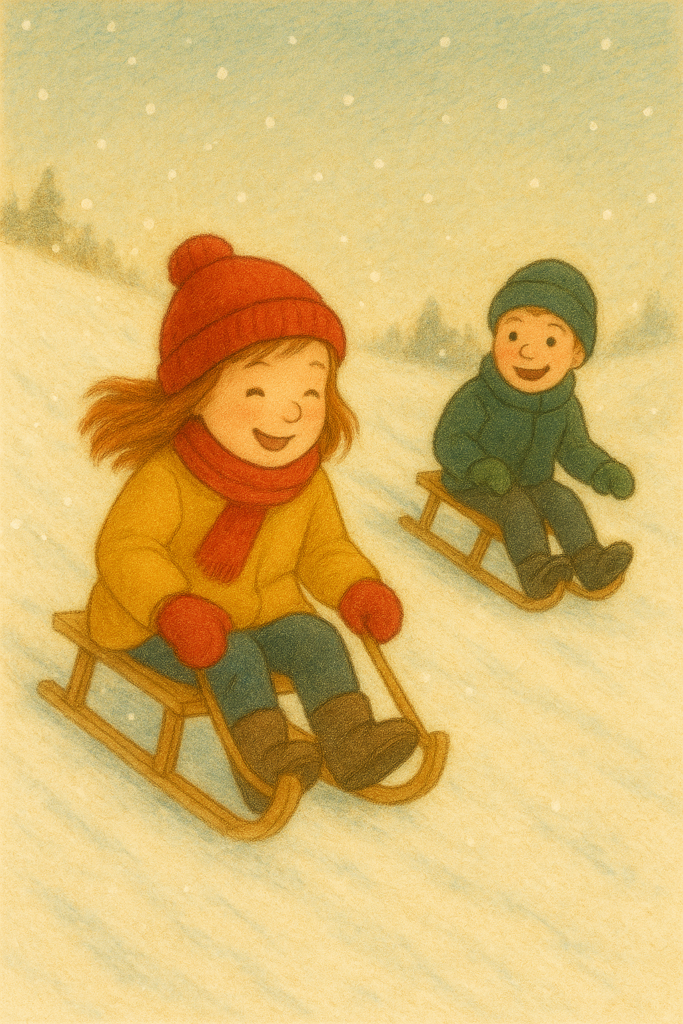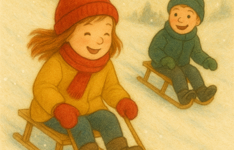 Sven hüpfte daneben auf und ab, sein Schlitten ungeduldig in der Hand. „Los, Frederike! Kommst du mit? Der Hügel ist super!“