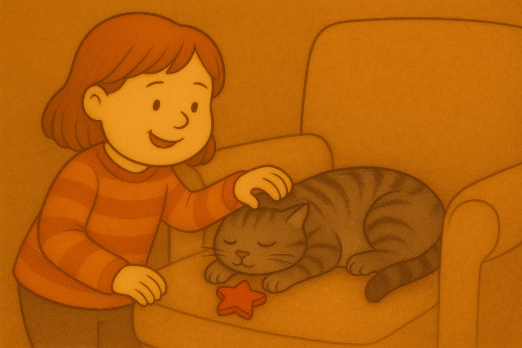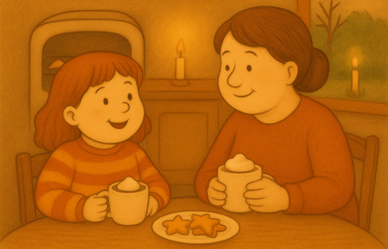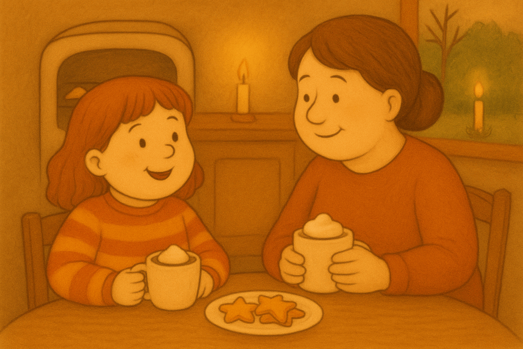 Als die Kekse im Ofen waren, setzten sich Frederike und Tante Ulla an den Tisch. Heißer Kakao dampfte in den Tassen. Im Hintergrund schnurrte Timmi — als wäre nichts gewesen.
