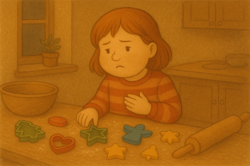 Auf dem Küchentisch lagen bunte Ausstechformen: Tannenbäume, Herzen und sogar kleine Engel. Frederike suchte ihre Lieblingsform — den roten Stern. Ein Stern mit fünf Zacken, glänzend rot. Jedes Backen ihrer Lieblingsplätzchen begann mit diesem Stern.