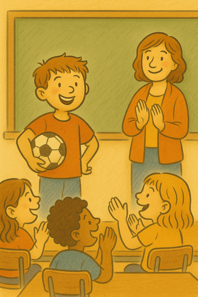 „Ich spiele Fußball!“, rief er stolz. „Ich bin Stürmer und habe schon ganz viele Tore geschossen. Und ich fahre auch total gern Fahrrad – fast jeden Tag bin ich unterwegs!“