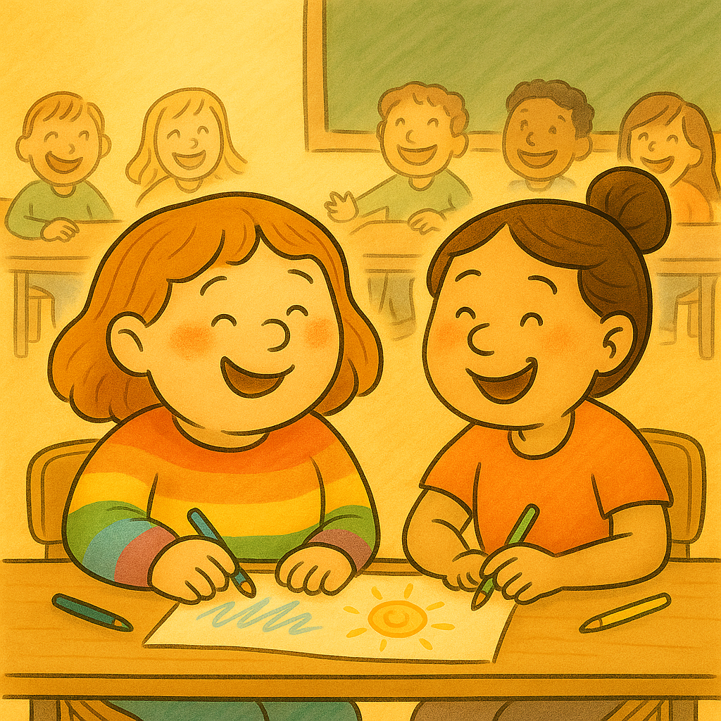 Sie saßen nebeneinander, lachten oft über kleine Witze und halfen sich gegenseitig bei den Aufgaben.
