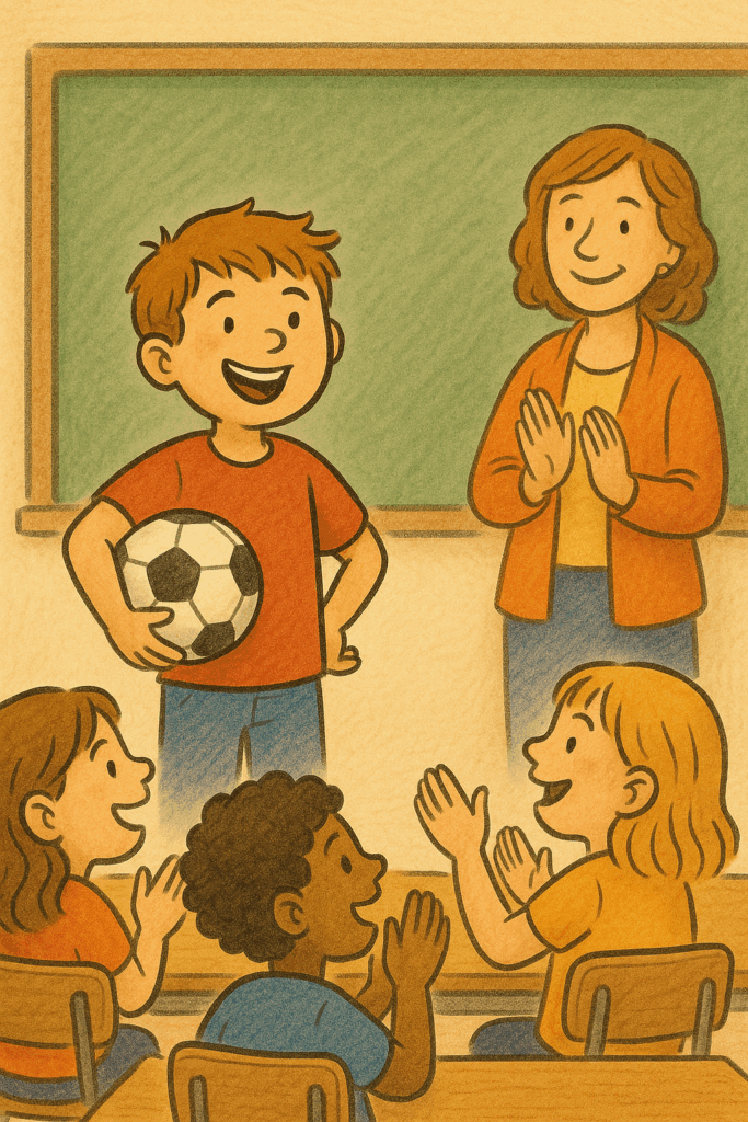 „Ich spiele Fußball!“, rief er stolz. „Ich bin Stürmer und habe schon ganz viele Tore geschossen. Und ich fahre auch total gern Fahrrad – fast jeden Tag bin ich unterwegs!“