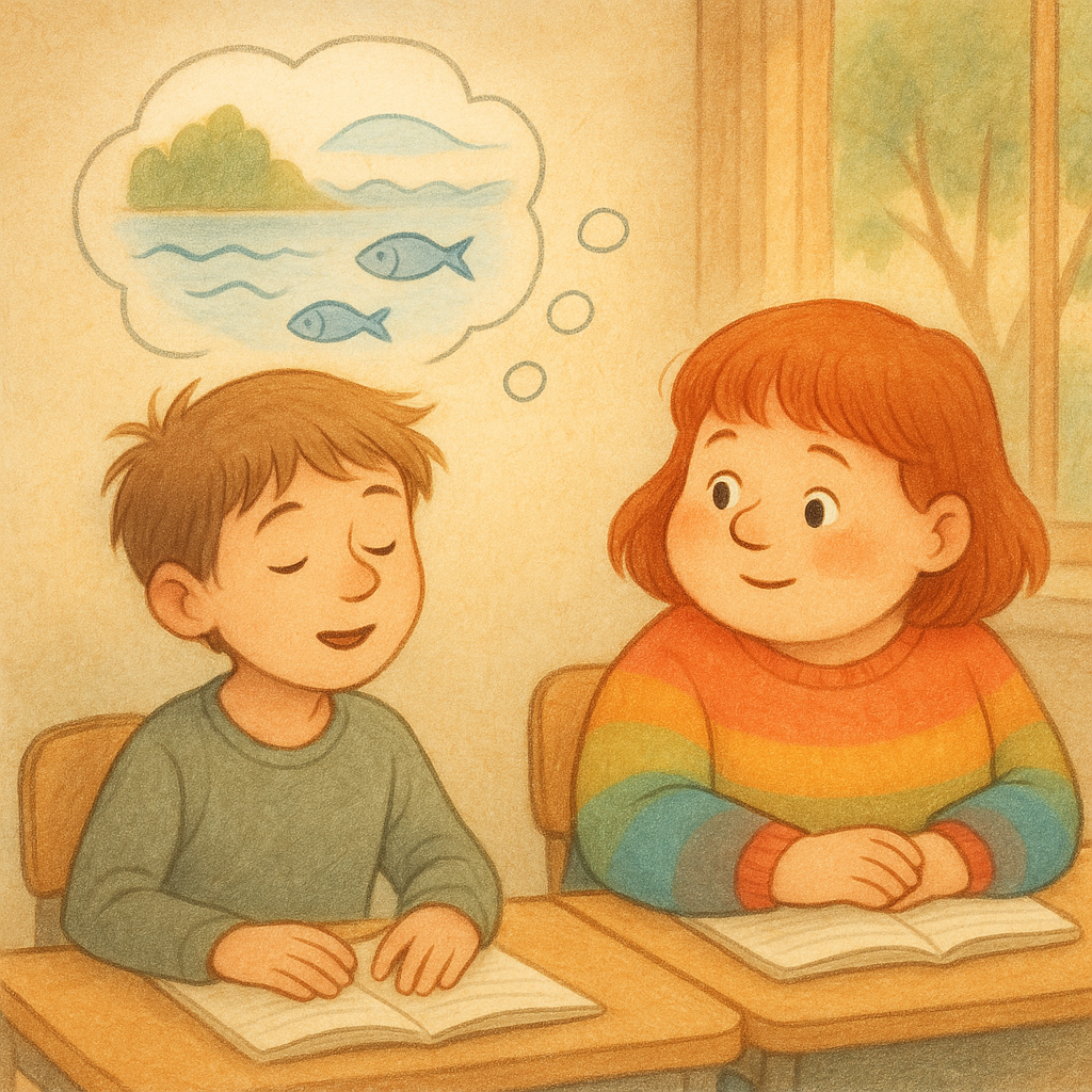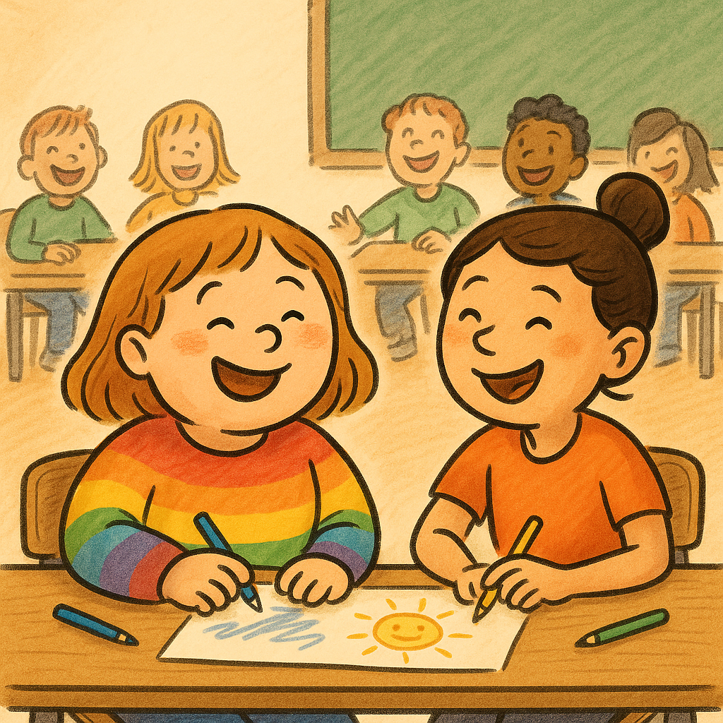 Sie saßen nebeneinander, lachten oft über kleine Witze und halfen sich gegenseitig bei den Aufgaben.